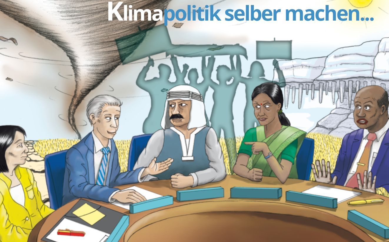 Keep Cool ist ursprünglich ein Brettspiel für sechs Personen, welches hier in wesentlich vergrößertem Format für den Einsatz in größeren Gruppen/Klassen vorliegt. Spielteams vertreten die Ländergruppen.